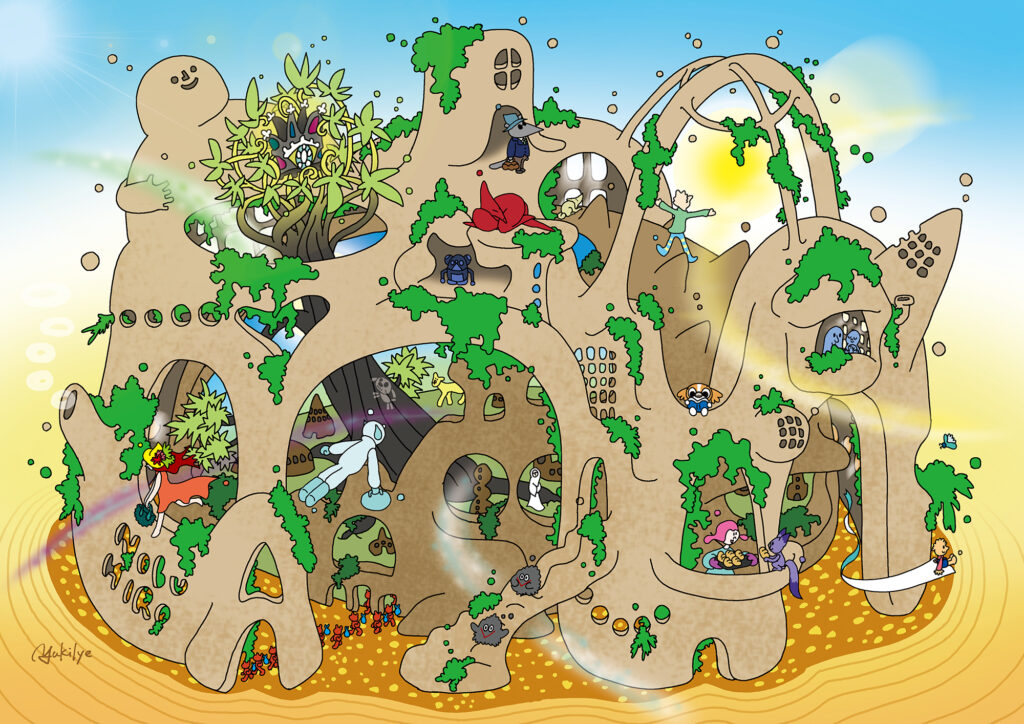 この場所には、人間だけでなく、動物や恐竜、ロボットなど、さまざまな存在が立ち寄ります。