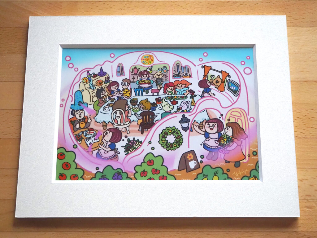 ここに描かれている私は心にゆとりがたっぷりあって、この絵をずーっと見ているだけで、自分が満足になるというか、幸せな気持ちでいっぱいになります。小さい頃からお客様が来ると嬉しくて用も無いのに親の側に座っていたおめでたい私ですが、その頃からこんな未来を夢見ていたのかなと、子どもだった頃の自分を愛おしく思えてきました。